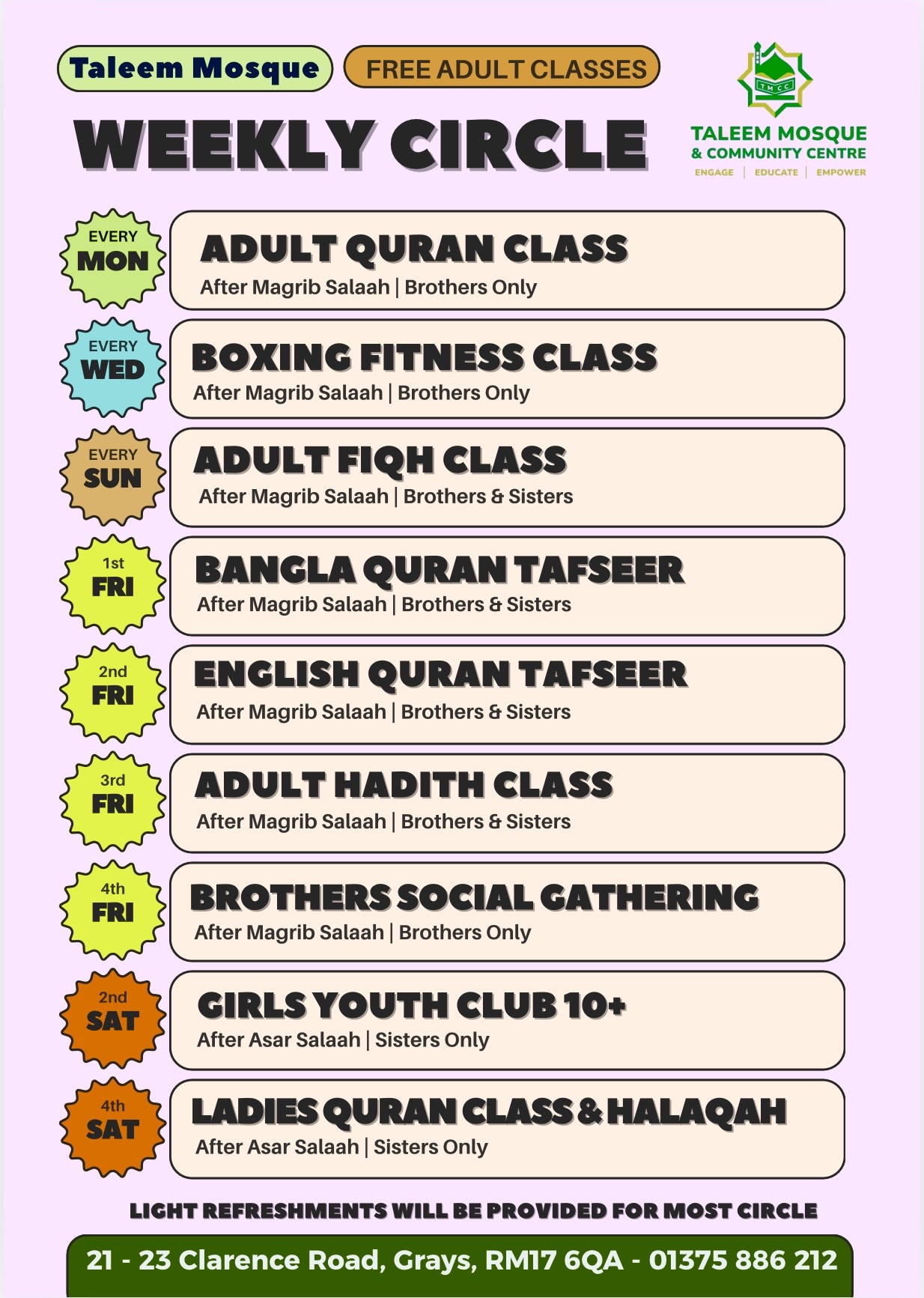 At Taleem Mosque & Community Centre, we are dedicated to providing a welcoming and inclusive space for individuals from all walks of life. Our primary focus is to serve as a place of worship for both men and women, allowing them to find solace and spiritual connection.